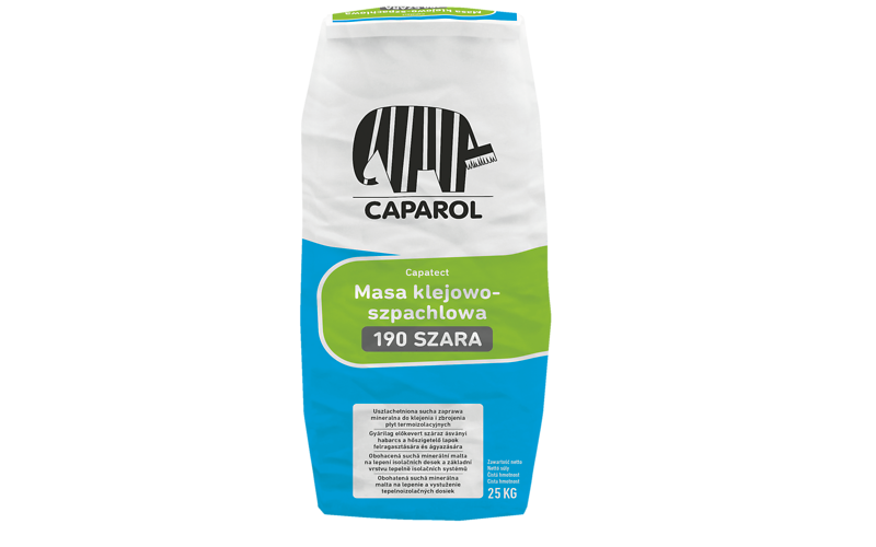 Klej Caparol 190 biały to masa klejowo-szpachlowa gotowa do użycia po wymieszaniu z wodą, na bazie białego cementu oraz hydratu wapnia, zbrojona włóknem, modyfikowana, hydrofobowa, wysoce dyfuzyjna, odporna na czynniki atmosferyczne, bardzo dobrze przyczepna do wszystkich podłoży mineralnych. Przeznaczona do mocowania oraz wykonywania warstwy zbrojonej na płytach styropianowych oraz płytach i lamelach z wełny mineralnej.