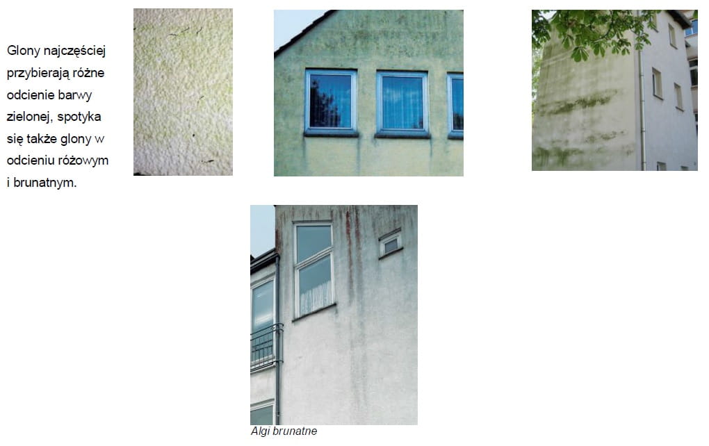 Podatne mogą być zwłaszcza elewacje budynków – ocieplonych i nieocieplanych, usytuowane w pobliżu zbiorników wodnych lub w bezpośrednim sąsiedztwie terenów zielonych. Głównym środowiskiem życia glonów jest woda. Komórki glonów zawierają chlorofil, podobnie jak rośliny. Do życia potrzebują światła i dwutlenku węgla oraz azotu i materiałów z podłoża. Na fasadach najczęściej spotyka się glony aerofityczne (powietrzne). Z reguły składają się one z pojedynczej komórki lub szeregu komórek o średnicy rzędu 10 μm (zbliżone wielkością do cząsteczek pyłu). Przemieszczają się za sprawą wiatru i osadzają się na elewacjach, gdzie przy sprzyjających warunkach (wystarczająca ilość wody i substancji odżywczych), zaczynają się rozmnażać, tworząc kolonie. Nalot z glonów przybiera barwę zieloną.