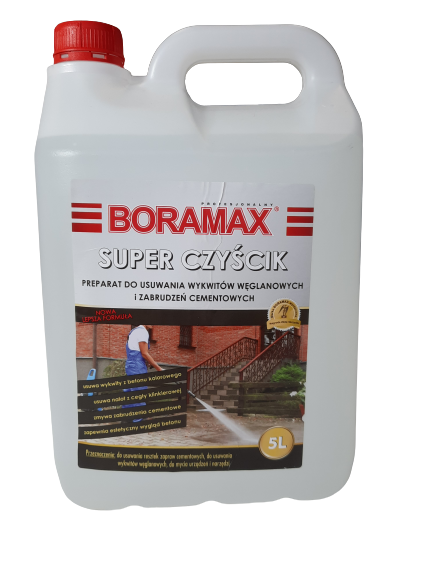 BORAMAX SUPER CZYŚCIK działa chemicznie, nie niszcząc oczyszczanych powierzchni. Usuwa wykwity z betonu kolorowego, nalot z cegły klinkierowej i zabrudzenia cementowe . Jest łatwy w użyciu i dostępny w opakowaniu o pojemności 5l.