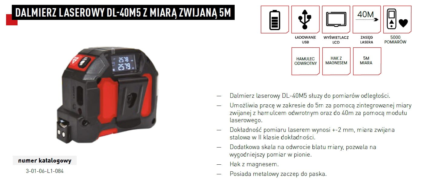 Dalmierz laserowy DL-40M5 z miarą zwijaną 5m