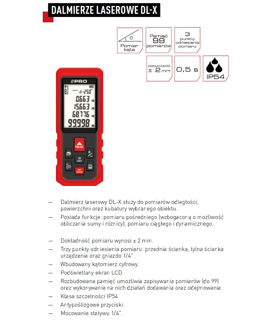 Dalmierz laserowy DL-X służy do pomiarów odległości, powierzchni oraz kubatury wybranego obiektu.