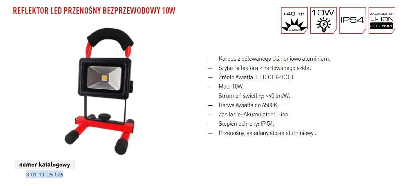 Lampa reflektor LED bezprzewodowy 10W>40l/W IP54 (OS-506)